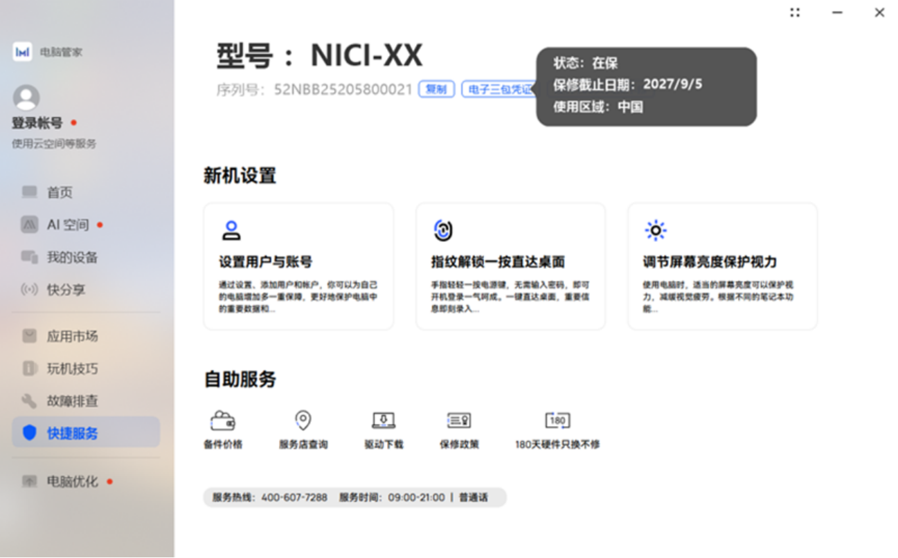 3. 在电脑管家主界面左侧菜单栏,点击“快捷服务”,在型号下方的“电子三包凭证”、“硬件180天只换不修”(如有),鼠标放到对应权益上方即可查看对应权益状态及相关信息。
